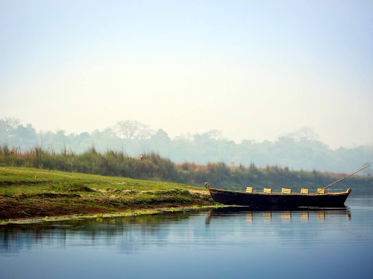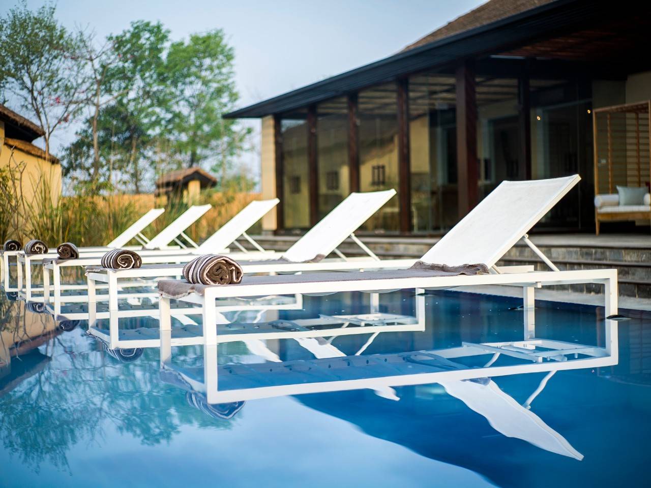Standing on the banks of the river Rapti, Meghauli Serai overlooks a vast expanse of rippling waters and the core of Chitwan National Park. This 30 room lodge is designed to showcase the spectacular wilderness and rooms as well as guest areas afford uninterrupted views of the jungle. The main lounge with an imposing chandelier made with 10,000 Nepalese hand painted beads. The lodge embraces local décor and aesthetics with an abundant use of local art and artefacts. The large Newari door leading to the lobby has been procured from a local Tharu village. A large infinity pool with a viewing deck and a ‘machan’ over the river for private dining and wildlife viewing add to the charm of this jungle lodge at Chitwan.